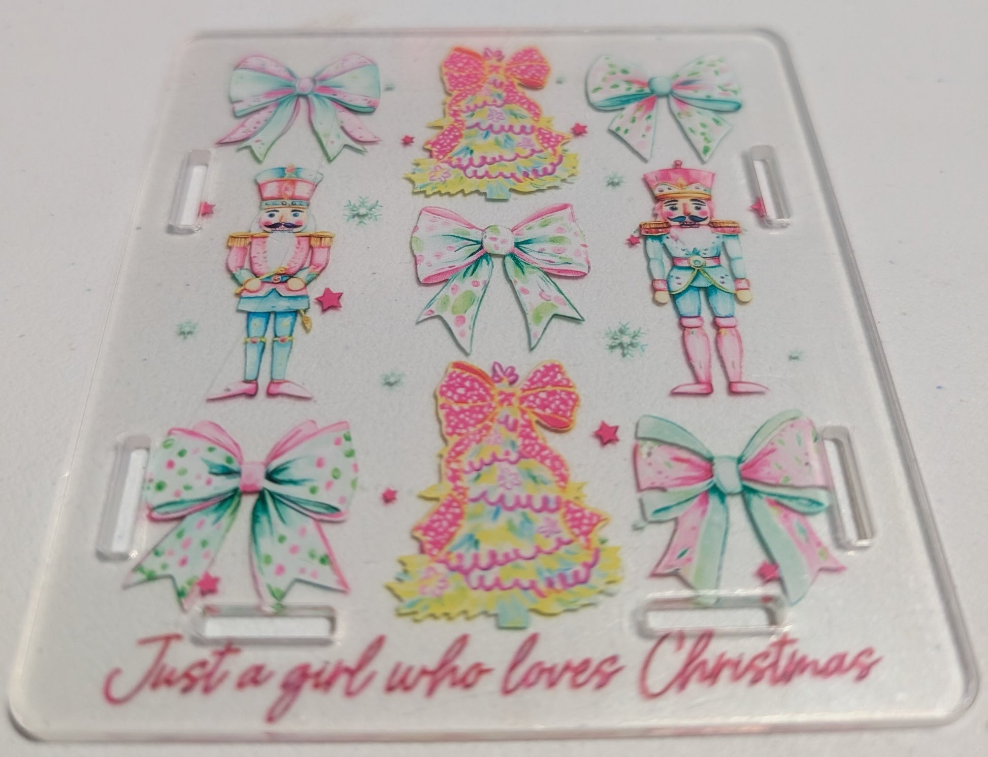 Pen box with "Just a Girl Who Loves Christmas" and Toy Soldiers, Christmas Trees and Bow Grid design. Pen box has design on front and back sides and three clear panels for sides and bottom. Use for pens, brushes or other items.