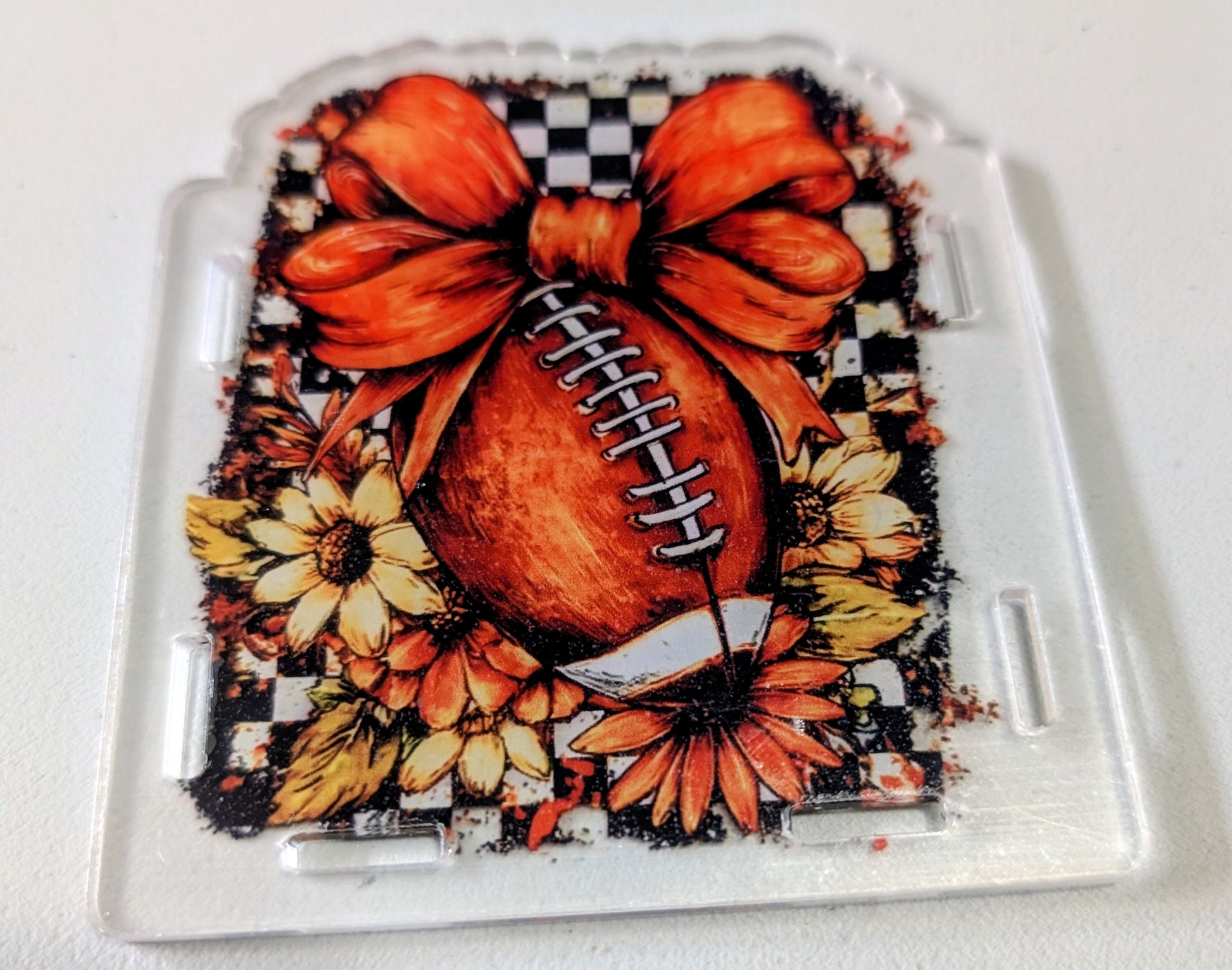 Pen box with football with flowers design. Pen box has design on front and back sides and three clear panels for sides and bottom. Use for pens, brushes or other items.