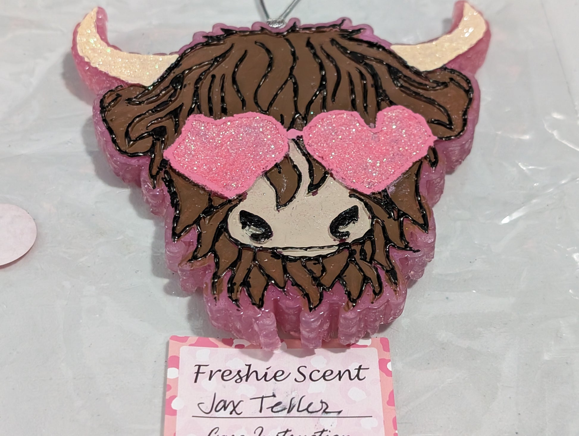 Highland Cow design wearing heart shaped glasses in the scent of "Jax Teller"
