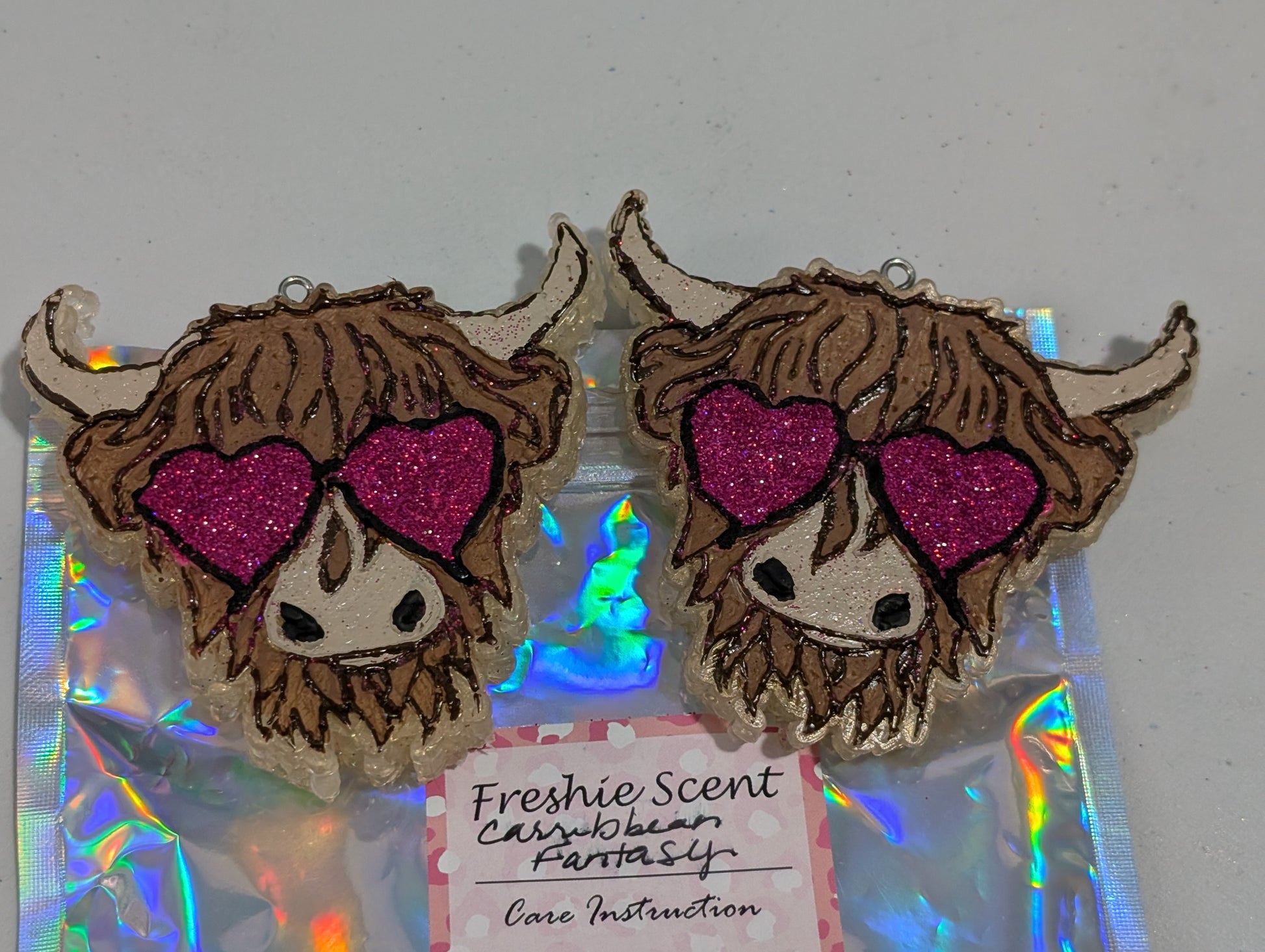 Highland Cow vent clips designed wearing heart shaped glasses in the scent of "Caribbean Fantasy"
