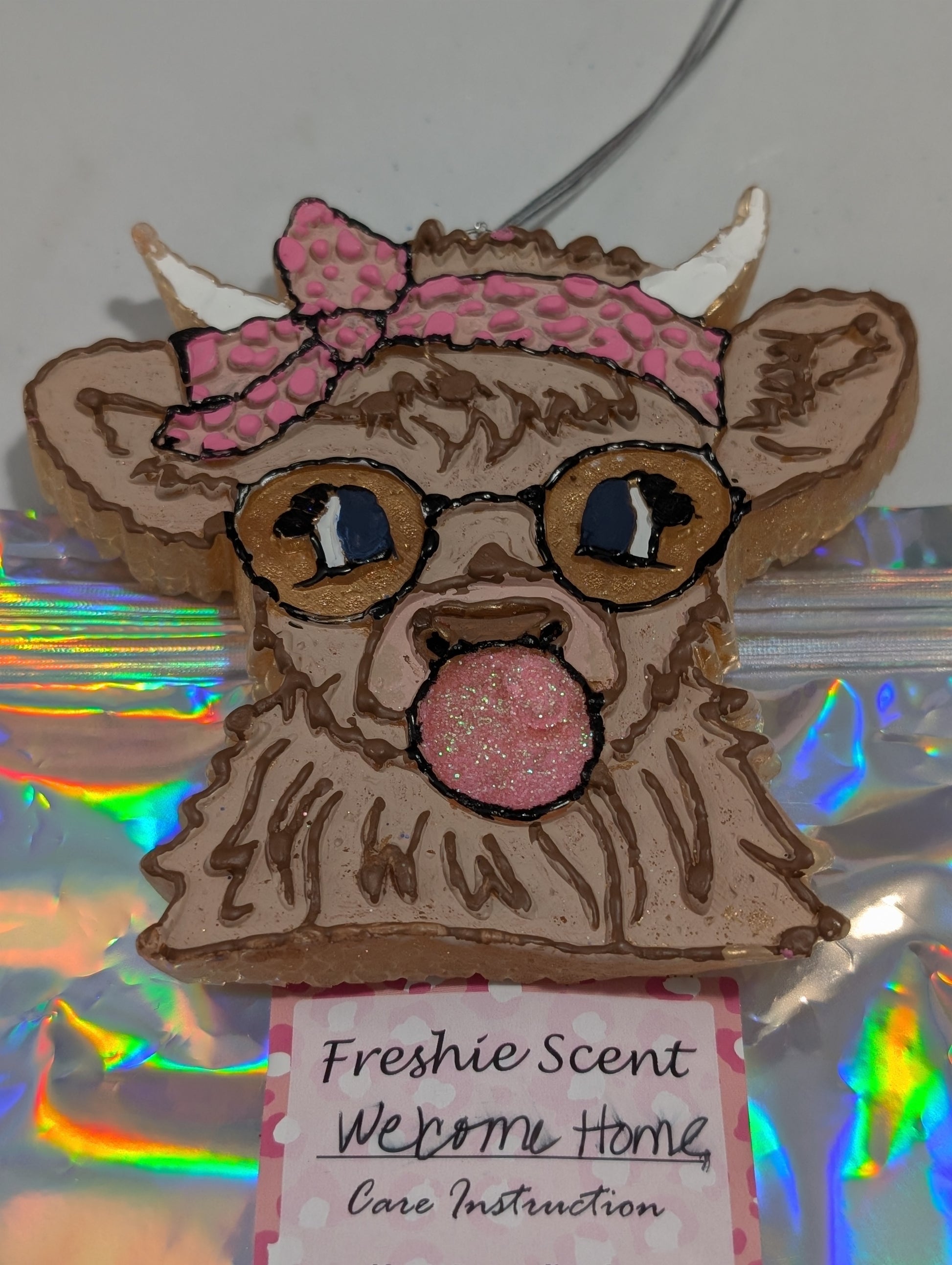 Highland cow design wearing a bow and blowing a bubble in the scent of "Welcome Homel"