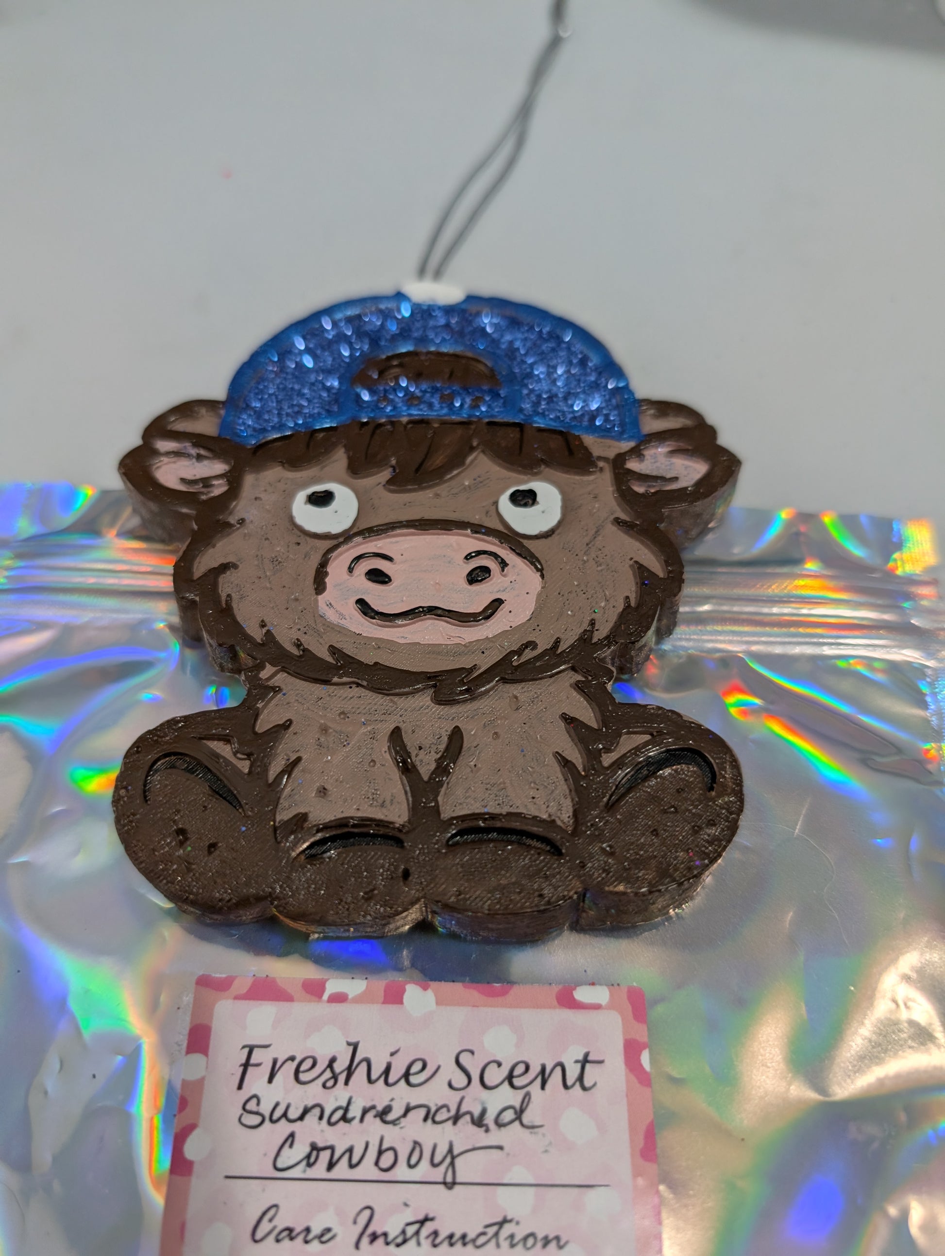 Highland cow with a baseball cap design in the scent of "Sundrenched Cowboy"