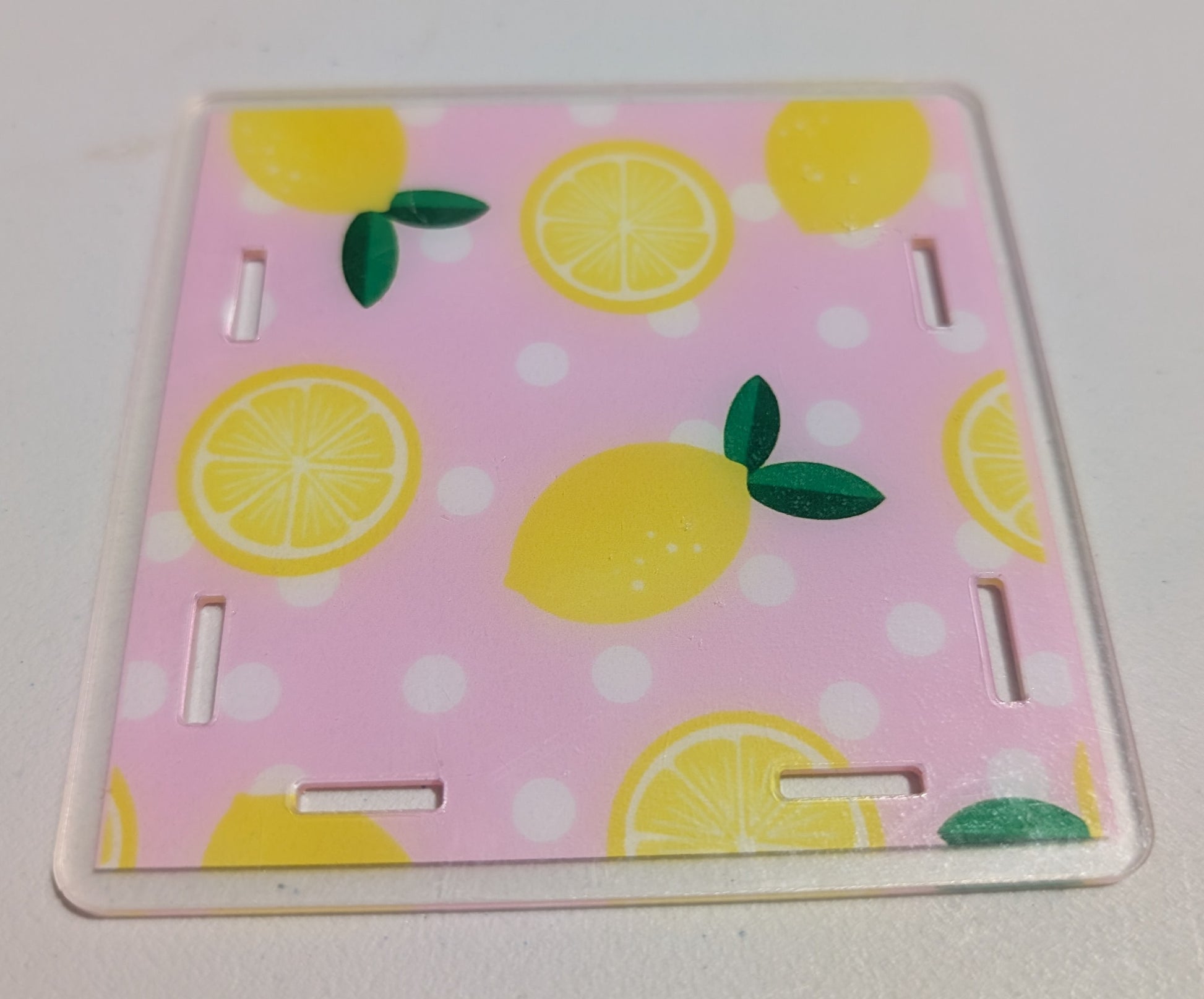 Pen box with Lemons on a Pink Polka Dot Background design. Pen box has design on front and back sides and three clear panels for sides and bottom. Use for pens, brushes or other items.
