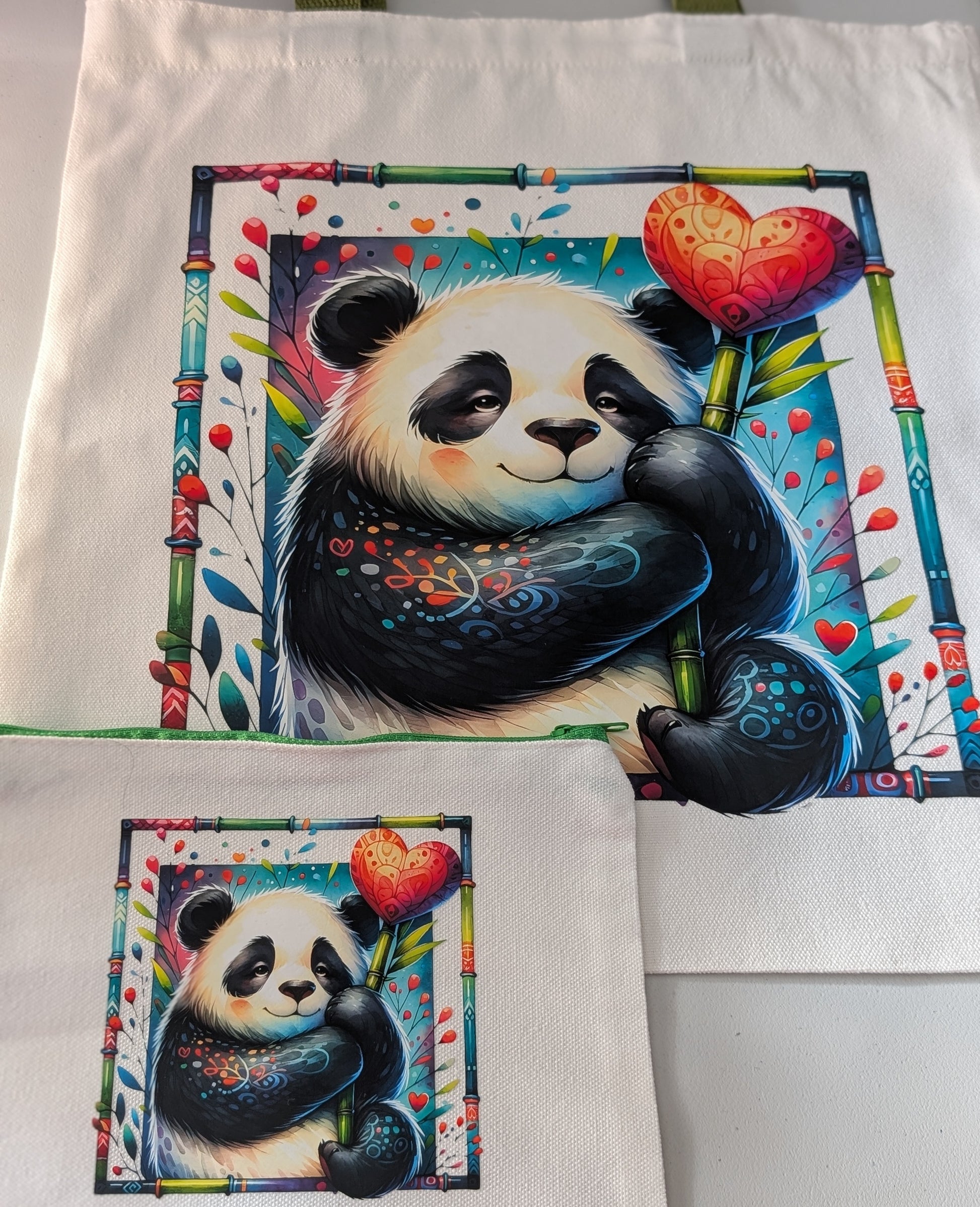 Panda Grab bag includes all Panda themed items: Tote and Cosmetic Bage set, T-Shirt print, Matching Trucker Hat print, 16oz Glass Cup with Decorated Bamboo Lid and Straw, Car Freshie.