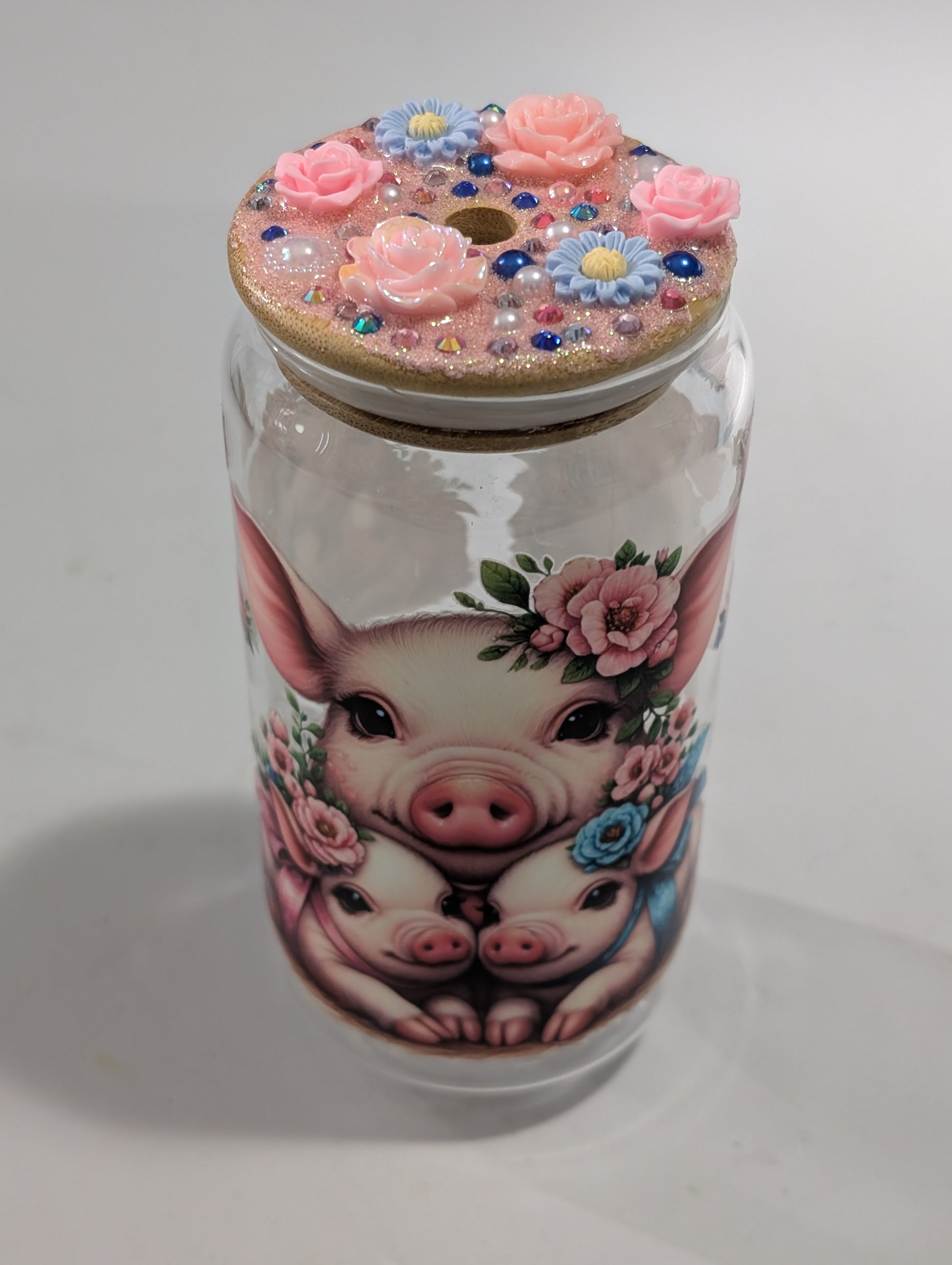 16oz Pig and Piglets Glass cup. Comes with matching decorated Lid and straw.