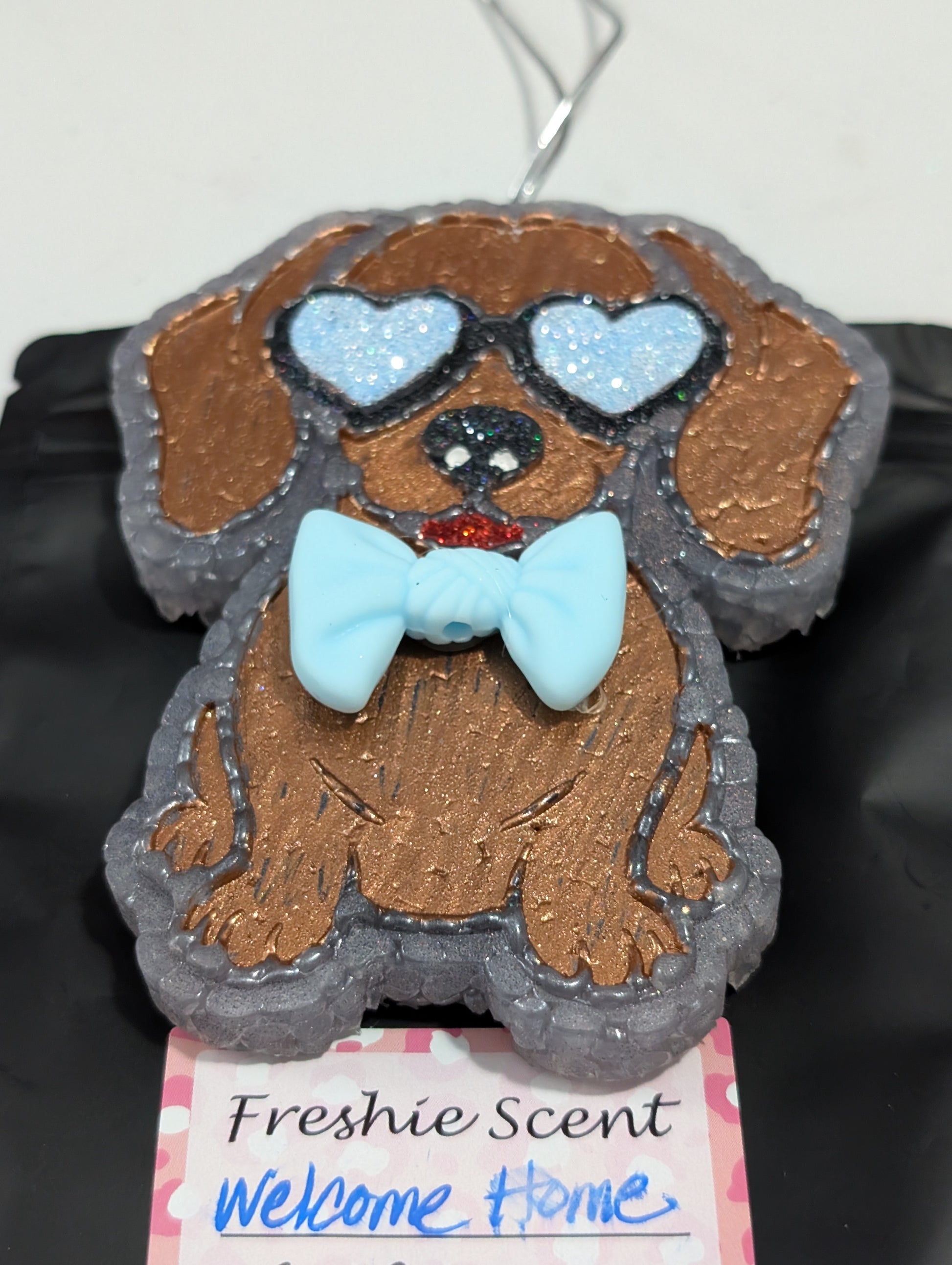 Dog design wearing heart glasses and a bow tie, in the scent of "Welcome Home"