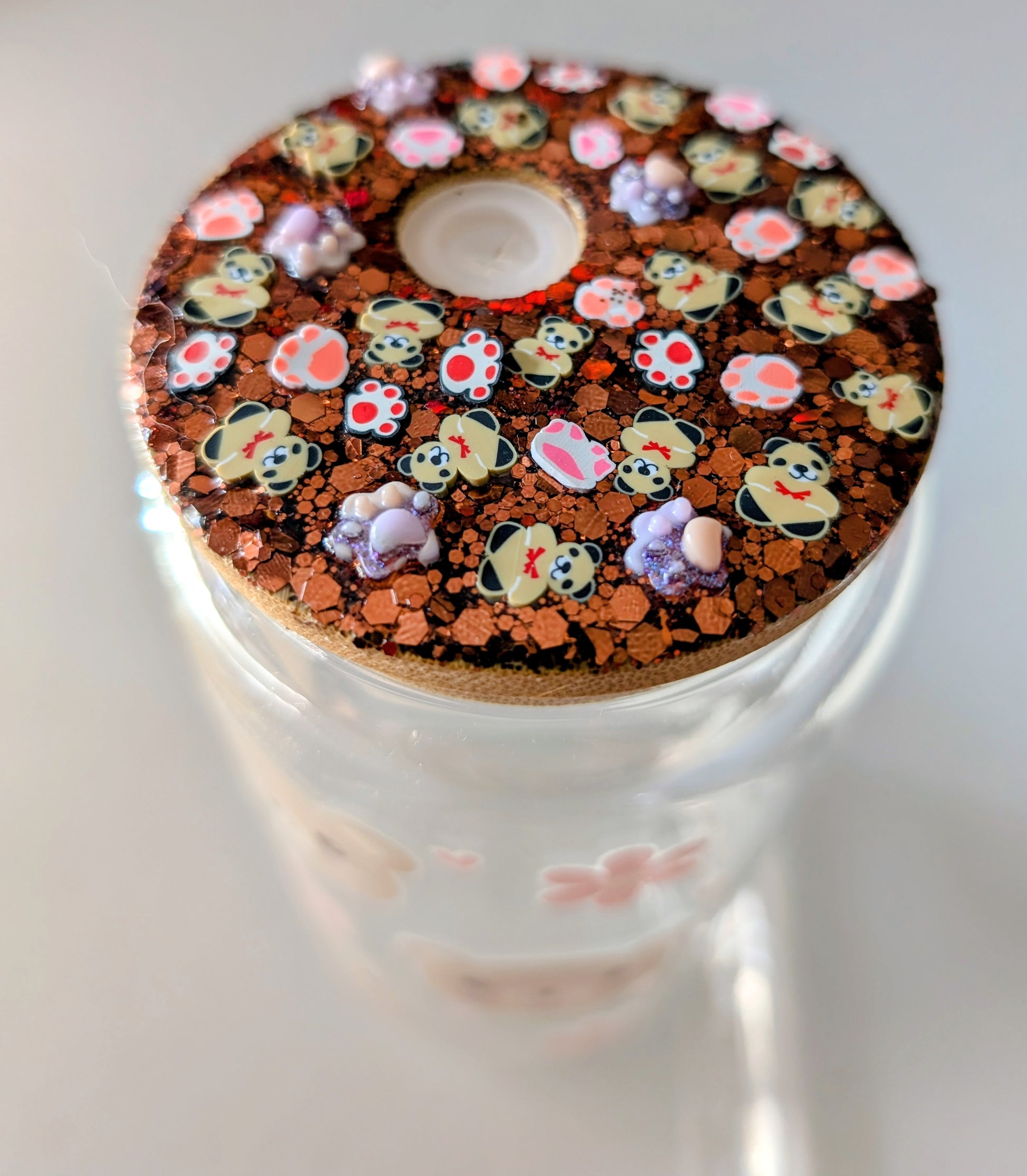 Teddy Bear Grab bag includes all Teddy Bear themed items: Tote and Cosmetic Bag Set, Trucker Hat, 16oz Glass Cup with Decorated Bamboo Lid and Straw, Wallet, Pen, and Car Freshie (Black Cherry).