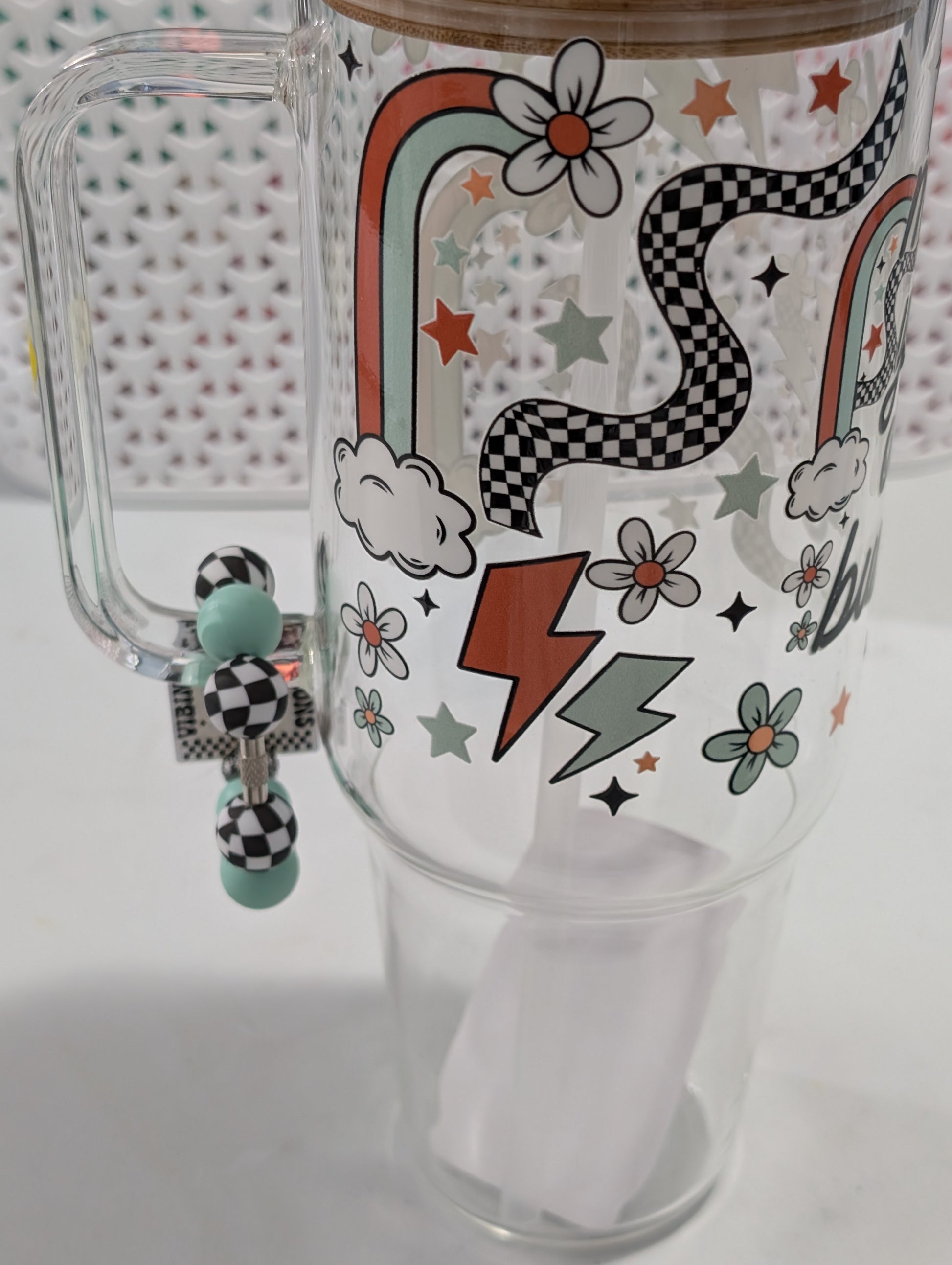 40oz Glass Mug stating, "Mind your own business". Comes with matching Decorated Lid, Cup Charm and straw.